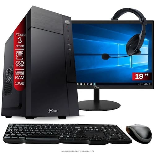 Processador Ryzen 3 3200G com gráficos integrados Radeon Vega 8.Placa-mãe A320.Memória RAM 16GB DDR4.SSD 960GB alta velocidade.Vídeo integrado Radeon Vega Graphics 8.Fonte 230W.Sistema operacional Windows 11 Pro Trial.Monitor 19".