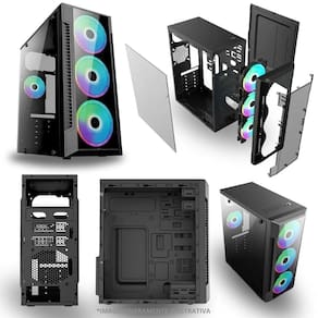Gabinete Gamer RGB com lateral em vidro temperado. PSU Cover para melhor acabamento interno. Sistema de refrigeração eficiente, equipado com 3 Fans RGB frontais.