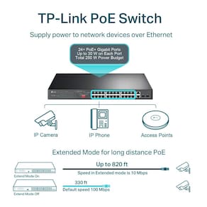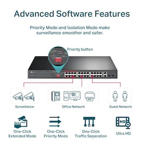 TP-Link Switch Fast Ethernet PoE de 24 portas 10/100Mbps 24 portas PoE+ @250W, com 2 portas Gigabit uplink + 2 compartimentos SFP combo modo de prioridade (TL-SL1226P), preto