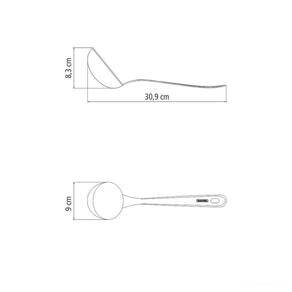 Totalmente feita de aço inox, por isso não solta nenhum resíduo nos alimentos, mantendo-os saudáveis. Altamente durável, mantém suas características , preservando a beleza, a higiene e a durabilidade do material. Possui furo no cabo, o que permite incluí-la na decoração da cozinha. Pode ser lavada diariamente na máquina de lavar louças.