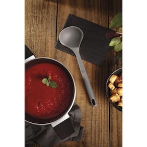Servir sopas, caldos e molhos fica mais fácil com a concha Tramontina Softta em silicone cinza. Resistente a até 210 C, ela é ideal para uso em panelas com revestimento antiaderente, sem causar riscos. O silicone de alta qualidade garante firmeza e no manuseio, enquanto o cabo anatômico oferece mais conforto durante o uso. Após o preparo, é só levar à lava-louça para uma limpeza descomplicada. Com visual moderno e acabamento neutro, a concha Softta é aquele item que une praticidade e bom gosto na medida certa.