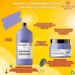 Este kit contém01 condicionador loréal blondifier 1500ml01 máscara loréal blondifier gloss 500mlA linhaA linha blondifier foi desenvolvida especialmente para um tratamento iluminador e neutralizante para loiros ou descoloridos. Deixando os fios loiros com muita vida e saúde.Toque macio, brilho e luminosidade intensos.Ativos Açaí polyphenols:Muito rico em polifenóis antioxidantes, protege o fio e reverte danos ocasionados pelo sol, poluição, altas temperaturas e desgaste diário dos fios. Vitaminas e ceramidas:Preenchem as estruturas capilares danificadas e porosas, dando resistência, força e mais movimento.Indicado- cabelos loiros.- cabelos com coloração.- cabelos descoloridos.- cabelos desbotados.- cabelos danificados.- cabelos amarelados.- todos os tipos de cabelos.Benefícios- hidratação.- luminosidade e brilho intenso.- reconstrução.- força.- proteção uv.- manutenção da cor.- maciez.- luminosidade.- equilibra o ph da fibra capilar.- nutrição.- proteção antioxidante. CondicionadorO condicionador loréal blondifier, conta com polifenóis antioxidantes do açaí, que repara as agressões diárias ocasionados pela poluição, clima e sol, deixando seu loiro com mais saúde e maciez incrível.Com ação hidratante, reacende a cor e devolve o brilho dos fios além de equilibrar o ph da fibra, garantindo cutículas seladas e sem o aspecto ressecado. MáscaraMáscara de tratamento para cabelos loiros, descoloridos ou com mechas que precisam de reparação.Loréal professionnel série expert blondifier com ação antioxidante, proporciona maciez e nutrição, trazendo vida e brilho intenso.Ela conta com uma fórmula nutritiva, que recupera as áreas porosas e reverte o ressecamento ocasionados pela coloração. Além disso, alinha cutículas para brilho intenso e efeito disciplinado.Modo de uso CondicionadorCom os cabelos limpos e úmidos, aplique uma quantidade suficiente no comprimento e pontas, sem aplicar na raiz. Massageie delicadamente as mechas.Deixe agir alguns minutos. Enxágue. MáscaraCom os fios limpos e úmidos, aplique e espalhe pelo comprimento e pontas, massageie as mechas e deixe agir alguns minutos. Enxágue. DicaPara melhores resultados, use a linha completa blondifier gloss de l'oréal.