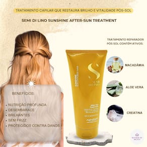Para um cuidado completo dos cabelos expostos ao sol, mar e piscina, combine a máscara de tratamento para cabelos danificados pelo sol com o shampoo Alfaparf Semi Di Lino After-Sun e o finalizador bifásico protetor Semi Di Lino Sunshine para uma rotina de cuidados intensiva e eficaz.