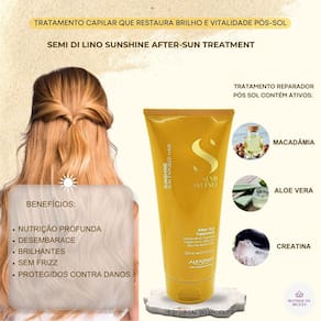 Para um cuidado completo dos cabelos expostos ao sol, mar e piscina, combine a máscara de tratamento para cabelos danificados pelo sol com o shampoo alfaparf semi di lino after-sun e o finalizador bifásico protetor semi di lino sunshine para uma rotina de cuidados intensiva e eficaz.