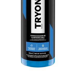 Tryon é um condicionador de plásticos 3 em 1, desenvolvido para restaurar plásticos internos, externos e borrachas. O produto é à base d’água e contém SiO2 em sua fórmula, o que proporciona alta durabilidade. Ele protege plásticos internos por até 12 meses, plásticos externos por até 3 meses e borrachas por até 6 meses. O produto oferece renovação e hidrorrepelencia, mantendo a superfície protegida.