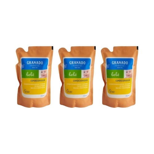 Condicionador granado bebê refil 250ml tradicional - kit com 3 unidades Descrição O condicionador granado bebê refil 250ml tradicional foi desenvolvido especialmente para os cuidados com os cabelos delicados dos bebês, oferecendo maciez, hidratação e desembaraço fácil. Sua fórmula suave é enriquecida com glicerina vegetal, proporcionando um cuidado nutritivo que respeita a sensibilidade do couro cabeludo infantil. Além de garantir fios sedosos e fáceis de pentear, o condicionador possui uma fragrância suave e clássica, que proporciona uma sensação de frescor e bem-estar após o banho. Com embalagem refil, o produto oferece uma opção mais econômica e sustentável, permitindo o reaproveitamento de embalagens anteriores. O condicionador granado bebê tradicional é dermatologicamente testado, hipoalergênico e livre de ingredientes agressivos, como corantes e parabenos, garantindo um uso seguro para a pele sensível dos pequenos. Ideal para o uso diário, ele cuida e protege os fios, deixando-os macios e cheios de vida. Modo de uso Após lavar os cabelos do bebê com shampoo, remova o excesso de água com as mãos. Aplique uma pequena quantidade do condicionador nas mãos. Distribua o produto de maneira uniforme pelos fios, evitando o contato direto com o couro cabeludo. Massageie suavemente, concentrando-se nas pontas, para facilitar o desembaraço. Enxágue bem com água morna, garantindo que todo o condicionador seja retirado, e seque com uma toalha macia.