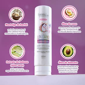 O Condicionador Magia de Unicórnio Forever Liss é a magia que faltava para os fios secos e danificados. Isso porque seu blend de óleos de coco, abacate e pracaxi somado à Tecnologia Magic Glow proporciona brilho imediato, reparação e fortalecimento dos cabelos.
