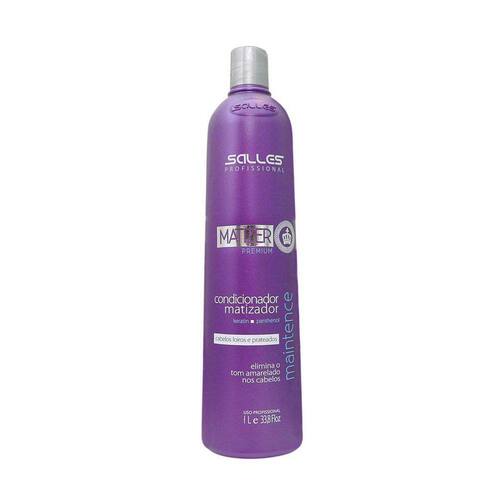 Condicionador Matizer Premium Maintence Tratamento - Salles Profissional, Nutre e Matiza os Cabelos LoirosNutre e Matiza os Cabelos Loiros Foi desenvolvidos para eliminar manchas amareladas de cabelos danificados e ressecados por processos químicos, deixando-os naturalmente enriquecidos pelos Nutrientes da Queratina e Pantenol. Adiciona brilho, maciez e desembaraçam suavemente os fios, contém proteínas que ajudam a fixar a coloração na fibra capilar.Condicionador: Ajuda a manter a cor no tom correto enquanto dá maciez. Tira a rigidez de fios danificados pela descoloração e garante maleabilidade.Contém:keratin: é uma proteína fibrosa produzida pelo organismo, responsável por 90% da constituição dos fios. Esta substância é capaz de garantir resistência, força e elasticidade à fibra capilar porque é rica em aminoácidos.Panthenol: é um poderoso hidratante. É o precursor do ácido pantatênico, uma vitamina muito importante para a saúde do cabelo.Passo a Passo:Após lavar os cabelos com o Shampoo Matizer, aplique o condicionador sobre o cabelo limpo e úmido, distribuindo de maneira uniforme. Em seguida, enxágue.Indicação: Para cabelos louros, descoloridos ou grisalhosEfeito: Atuam na neutralização dos tons alaranjados em cabelos louros e descoloridos, e tons amarelados em cabelos grisalhos.