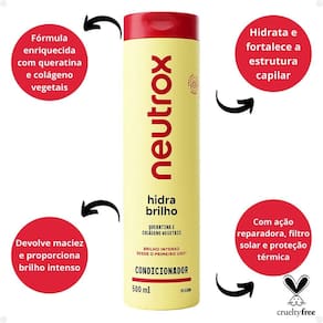 O Condicionador Hidra Brilho sela as cutículas dos fios hidratando profundamente os cabelos, devolvendo seu brilho desde o primeiro uso. Com queratina e colágeno vegetais, em conjunto com os demais ingredientes, sua fórmula hidrata e fortalece os fios, restaurando a suavidade e proporcionando um cabelo hidratado e macio. A linha hidra brilho é ideal para cabelos opacos e desidratados. Vegano. Não testado em animais. Combinação exclusiva com ação reparadora, filtro solar e proteção térmica que blinda os fios.