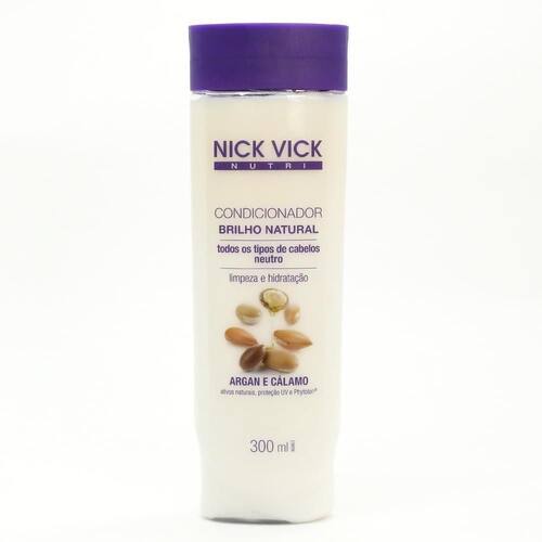 O Condicionador Brilho Natural Nick Vick Nutri contém formulação enriquecida com Argan e Cálamo que limpam suavemente os cabelos e promovendo hidratação.