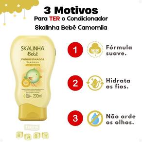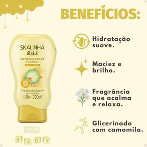 Modo de Uso/AplicaçãoApós lavar os cabelos do bebê com shampoo, aplique o Condicionador Skalinha Bebê Camomila nos cabelos molhados, massageando suavemente o couro cabeludo e os fios.