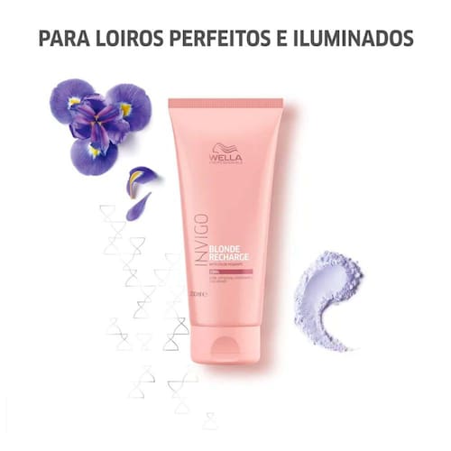 O Condicionador Wella Professionals Cool Blond Recharge Invigo é indicado para cabelos loiros coloridos, naturais ou com mechas. Elimina os tons amarelados e acobreados indesejados com seus pigmentos violeta, além de desembaraçar dos fios de forma suave. Além disso, mantém a cor bonita, com muito brilho, fios suave ao toque e fragrância floral delicada, com lírio do vale, rosas, sândalo e baunilha. Confere fios hidratados por muito mais tempo. Benefícios: - Neutraliza tons amarelados e acobreados; - Hidrata intensamente; - Brilho luminoso. Resultado: Seu cabelo fica desembaraçado, com um loiro mais bonito, iluminado e livre dos tons amarelados e acobreados. Modo de usar: Aplique o condicionador sobre o cabelo limpo e úmido, pelo comprimento e pontas. Depois de alguns instantes, enxágue.