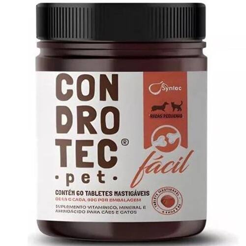 Condrotec Pet Fácil C/60 Tabletes Mastigáveis 90G Para 5Kg - Syntec Descrição: Condrotec pet fácil é um suplemento alimentar palatável à base de condroitina a, glucosamina, vitamina c e zinco. Indicado para cães e gatos de todos os portes e fases da vida para aporte dos nutrientes compostos na formulação.