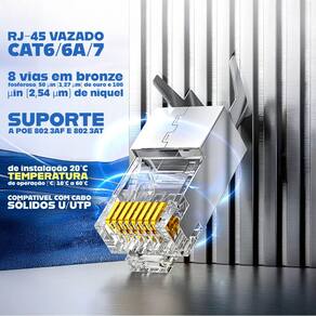 O Conector RJ45 Blindado Vazado é desenvolvido para instalações profissionais que exigem alta performance, precisão e estabilidade em redes de alta velocidade. Seu corpo em termoplástico com capa metalizada reduz interferências externas, enquanto o design vazado permite a visualização dos fios, facilitando a montagem e evitando erros de crimpagem. Compatível com cabos sólidos U/UTP 22–24 AWG, oferece excelente condução graças aos contatos em bronze fosforoso com banho de ouro e níquel. Suporta POE 802.3af/at e apresenta alta resistência para instalação interna. Acompanha suporte organizador de fios, garantindo alinhamento perfeito, maior agilidade e produtividade no processo de montagem.