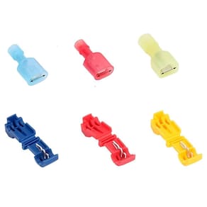 T1 Fêmea (20 Unidades): Vermelho, para fios de 0,5 a 1,5 mm. T2 Fêmea (20 Unidades): Azul, para fios de 1,5 a 2,5 mm. T5 Fêmea (20 Unidades): Amarelo, para fios de 4 a 6 mm. T1 Macho 1.25-250 (20 Unidades): Para fios de 0,5 a 1,5 mm. T2 Macho 2-250 (20 Unidades): Para fios de 1,5 a 2,5 mm. T5 Macho 5-250 (20 Unidades): Para fios de 4 a 6 mm.