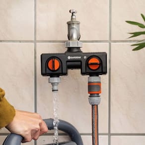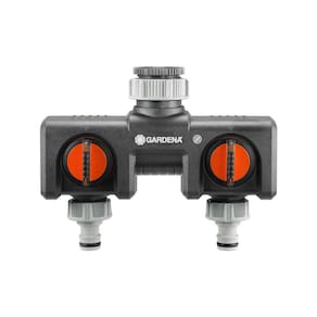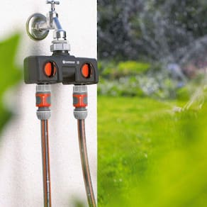 A ligação de duas vias da Gardena permite ligar, em simultâneo, dois acessórios a uma torneira. As saídas são totalmente ajustáveis. É possível utilizar dois temporizadores de rega da Gardena nesta ligação. A ligação de duas vias da Gardena é adequada para torneiras com uma rosca de 33,3 mm (G 1").