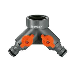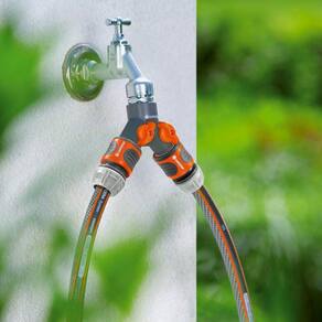 O conector de duas vias Gardena serve para colocar dois acessórios em funcionamento. Deste modo, nunca é necessário trocar duas mangueiras na torneira. As duas saídas são totalmente ajustáveis e independentes uma da outra. Para torneiras de 26.5 mm (G 3/4").