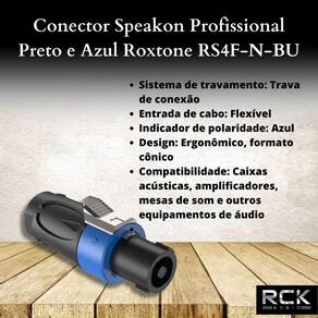 O Conector Speakon Profissional Preto e Azul Roxtone RS4F-N-BU é um tipo de conector utilizado em cabos de áudio profissionais, especialmente em sistemas de som de grande porte, como caixas acústicas e amplificadores. Ean: 7898957852383