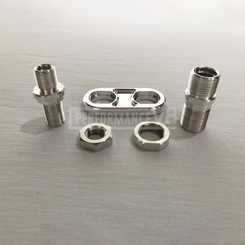Conexão Billet de Passagem para Ar Condicionado: -Fabricado em CNC de alumínio T-6061; -Acabamento natural polido; -Modelo universal, compatível com todos os anos e modelos para carros antigos; -Conexão de roscas padrão pressão e retorno; -Alto padrão de acabamento. Recomendamos que a instalação seja realizada por um profissional qualificado. : 3 meses Marca: PerformanceV8 Ean: 7999603057517