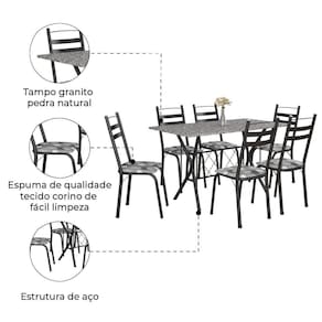 O Conjunto de Mesa Itália New com 6 lugares possui design moderno que se adapta a qualquer ambiente. Contém tampo retangular em granito resistente a altas temperaturas, e as cadeiras são revestidas em tecido de fácil limpeza. Ainda conta com base da mesa e cadeiras em aço, garantindo resistência e durabilidade. MEDIDAS: Medidas da Mesa (Base + Tampo): A: 77 cm L: 140 cm P: 75 cm Medidas da Cadeira: A: 95,5 cm L: 44,3 cm P: 40 cm MARCA: Artefamol MODELO: Conjunto De Mesa Itália New Com 6 Cadeiras 1,40m Artefamol Granito COR: Dark/Granito MATERIAL: Base e Cadeira de Aço TAMPO MESA: Granito PESO MESA: 67,8kg (Base + Tampo) PESO CADEIRA: 3,83kg CADEIRAS SUPORTAM: 100kg MESA SUPORTA: 100kg PÉS: Sapatas de borracha ITENS INCLUSOS: 1 Base, 1 Tampo e 6 Cadeiras Montagem não inclusa. Entregamos até a porta de entrada da casa do cliente ou até a portaria do condomínio. Medidas da Mesa (Base + Tampo):: A: 77 cm L: 140 cm P: 75 cm | Medidas da Cadeira:: A: 95,5 cm L: 44,3 cm P: 40 cm | MARCA:: Artefamol | MODELO:: Conjunto De Mesa Itália New Com 6 Cadeiras 1,40m Artefamol Granito | COR:: Dark/Granito | MATERIAL:: Base e Cadeira de Aço | TAMPO MESA:: Granito | PESO MESA:: 67,8kg (Base + Tampo) | PESO CADEIRA:: 3,83kg | CADEIRAS SUPORTAM:: 100kg | MESA SUPORTA:: 100kg | PÉS:: Sapatas de borracha | AVISO:: Montagem não inclusa. Entregamos até a porta de entrada da casa do cliente ou até a portaria do condomínio. Cor: Craquelado Dark