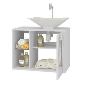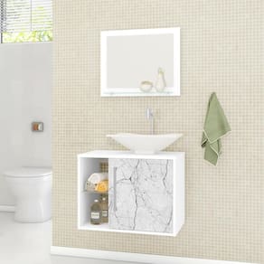 A Móveis Bechara trás produções com alto nível de qualidade. Com uma linha de produtos moderna e inovadora. O Conjunto para Banheiro Baden é perfeito para o seu banheiro. O kit é composto por espelheira e gabinete com cuba de apoio em mármore sintético. Produzido em MDP, com secagem UV e impressão a laser. Tem acabamento com pintura da superfície em verniz poliéster brilhante. O acabamento das bordas é com fita de papel decorativo aplicado mecanicamente por sistema hot melting. Conta com 1 prateleira de vidro na parte superior da espelheira e 2 no gabinete, sendo 1 de vidro e 1 prateleira interna em MDP. Puxador de plástico com acabamento cromado e dobradiças metálicas.