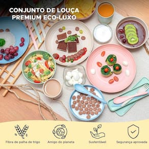 Aparelho de jantar ecológico multicolorido com peças nas cores: laranja, amarelo, azul e verde. Produzido em PP com fibra de trigo, é extremamente resistente inquebrável , pode ser levado ao micro-ondas, freezer e máquina de lavar louças. É 100% reciclável e livre de BPA, fácil de limpar e não risca.