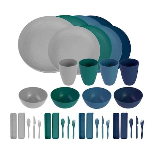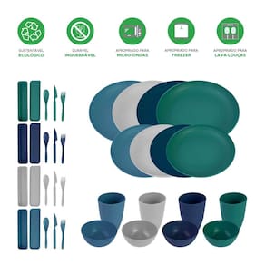 Aparelho de jantar ecológico multicolorido com peças nas cores: branco, azuis e verde. Produzido em PP com fibra de trigo, é extremamente resistente inquebrável , pode ser levado ao micro-ondas, freezer e máquina de lavar louças. É 100% reciclável e livre de BPA, fácil de limpar e não risca.