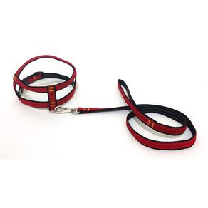 Peitoral confeccionado em tecido de veludo liso e nylon; Presilha com regulagens de tamanho em plastico resistente; Guia em tecido de veludo liso e nylon; Mosquetão médio com trava de segurança; Indicado para cachorros de pequeno e médio porte. Cor: vermelho com preto
