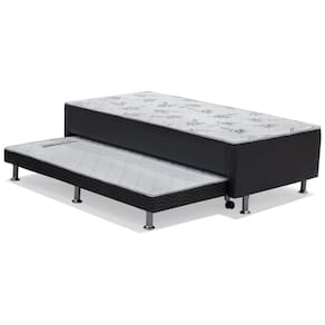 Conjugado Cama Napa Nero Vazado possui um Colchão acoplado a a Cama, além de uma cama extra para acomodadar suas visitas que pode ser guardada dentro do Box quando não está sendo utilizada. É composto 100% com madeira de reflorestamento, preocupação da Ortobom com o meio ambiente. Seu revestimento é em Napa Preto. A Cama acompanha jogo de pés em PVC. Combinação perfeita de Modernidade e Praticidade em um só produto.