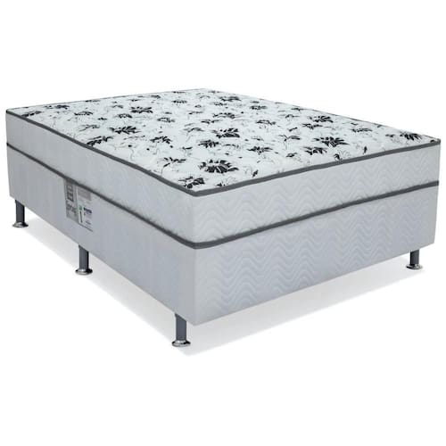 Material da base: Estrutura composta pelo avançado molejo Nanolastic com caixa Ortopédica em madeira Eupalipto Domus de Reflorestamento. Tecido Viscopoli com bordado em Matelassê. Jogo de Pés.