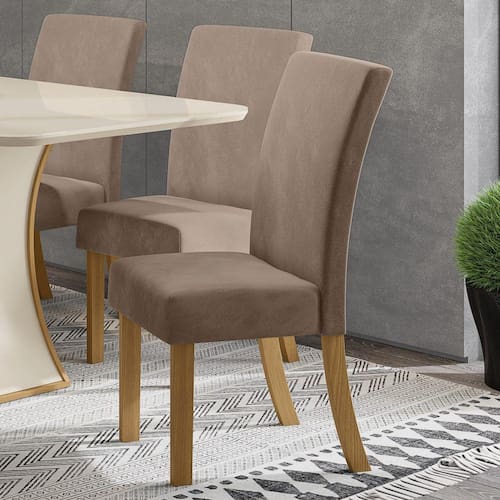 FICHA TÉCNICA: Escala de Brilho Cadeiras: Fosco Cadeiras Possui Rodízio: Não Peso Suportado por Cadeira: 120 Kg Estrutura Assento: MDP/MDF Revestimento Assento: Tecido Suede Enchimento Assento: Espuma D18 Almofada Assento: Não possui Tipo Assento: Fixo Estrutura Encosto: MDP/MDF Revestimento Encosto: Tecido Suede Enchimento Encosto: Espuma D18 Tipo Encosto: Fixo Material dos pés: MDF Medidas Montado: 95 x 43 x 56 Cm Peso Montado: 7,5 Kg