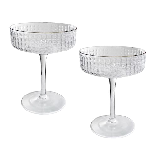 Elegância e estilo para brindar momentos especiais! O conjunto Spike traz duas taças coupe de 200ml, perfeitas para servir espumantes, coquetéis clássicos e sobremesas com sofisticação. Feitas em vidro de alta qualidade, possuem acabamento refinado e detalhe na borda dourada, que adiciona um toque de luxo à sua mesa. O design atemporal da taça coupe, aliado ao brilho da borda, faz deste conjunto uma excelente opção para ocasiões especiais ou para presentear.