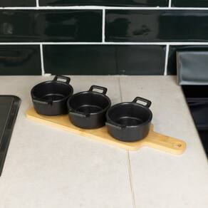 Conjunto 03 Petisqueiras Redondas de Porcelana Preta com Bandeja de Bambu Wolff