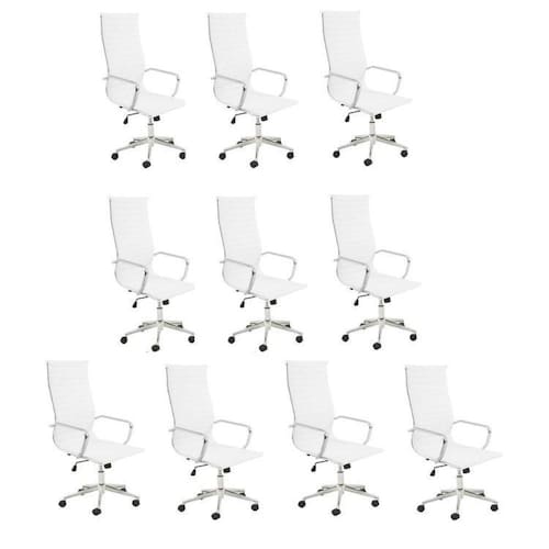 Conjunto com 10 cadeiras de escritório com estrutura em aço, revestimento em Poliuretano, com encosto alto. Possui base giratória em aço cromado e rodízios em nylon. Possui ajuste de altura (mínimo 105cm e máximo 115cm) e sistema relax. Produto Montado: Sim Altura do Conjunto: 105 cm Ambiente: null Ambiente Principal: Escritório Apoio para Braços Estofado: Não codigo_ean: 7909903313657 Complexidade da Montagem: Baixa: pode ser montado por uma pessoa sozinha Cor: Branco Cor da Base: Cromado Cor do Produto: Branco Empilhável: Não Giratória: Sim Informação Complementar: 1x Conjunto 2 Cadeiras de Escritório Presidente Giratória Sevilha Alta Branco Largura: 60 Altura: 105 Peso: 10.2 Profundidade: 60 Necessita Montagem: Sim