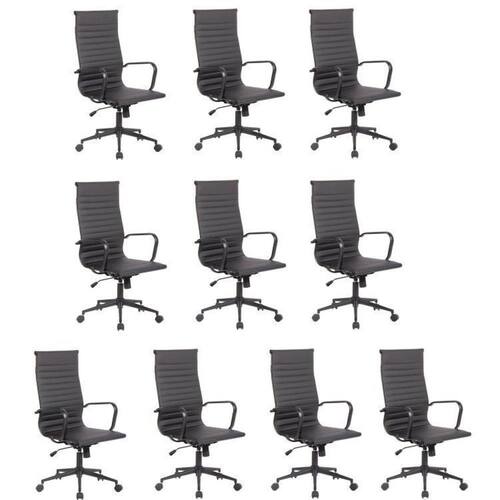A Cadeira Sevilha já é queridinha do design e garante que seu espaço de trabalho e estudos seja confortável e funcional. Seus detalhes em aço preto dão o toque diferente que seu ambiente merece! Design contemporâneo que agrega elegância e estilo para o seu dia a dia. Conjunto com 10 Cadeiras de escritório com estrutura em aço pintado à pó preto, revestimento em poliuretano (PU), com encosto alto. Possui base giratória em aço pintado à pó preto e rodizíos em nylon. Possui ajuste de altura (mín 105cm e máx 115cm) e sistema relax. Altura do Conjunto: 105 cm Ambiente: null Ambiente Principal: Escritório Cor: Preto Informação Complementar: 1x Conjunto 2 Cadeiras de Escritório Presidente Sevilha Alta com Base Office PretoLargura: 60 cmAltura: 105 cmPeso: 10,7 kgProfundidade: 60 cmNecessita Montagem: Sim2x Conjunto 4 Cadeiras de Escritório Presidente Sevilha Alta com Base Office PretoLargura: 60 cmAltura: 105 cmPeso: 10,7 kgProfundidade: 60 cmNecessita Montagem: Sim Possui Rodízio: Sim Suporta Até (kg): 120 kg