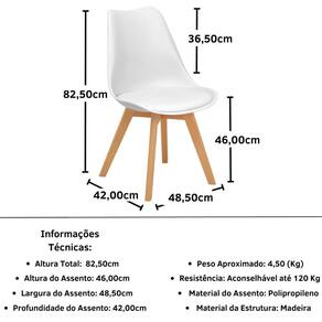 Tonalidade: Branco | Altura: 82,50 | Produto: Cadeira de Jantar Leda | Largura: 48,50 | Material da Estrutura: Madeira | Cor: Branco | Peso do Produto: 4,50 | Fabricante: Magazine Decor | Cômodo Indicado: Cozinhas | Acompanha Braço: Não | list_price: ,99 | Necessita Montagem: Sim | batteries_required: Não | included_components: 10 Cadeiras | is_fragile: Não | part_number: 1 | number_of_boxes: 2 | model_number: 1 | item_package_weight: 40 | bullet_point#0: A Cadeira de Jantar Eames Wood Leda vai dar um up na decoração do seu lar! Feitas em material de excelente qualidade, as cadeiras Eames Wood Leda Design são uma ótima escolha para fazer parte de cômodos como sala de jantar, área de recreação e lazer, entre outros locais | bullet_point#1: Apresentadas em , elas podem ser inseridas na decoração de diferentes estilos. As cadeiras Eames Wood Leda Design são ideais para quem está em busca de conforto e um design diferenciado. | bullet_point#2: Um diferencial importante destas cadeiras é que elas possuem uma base de madeira, este material confere mais resistência à cadeira e é um toque de estilo a mais no modelo. Vale a pena apostar nesta cadeira, a versatilidade permite que ele seja colocado em diversos espaços da casa. | number_of_items: 10 | Coleção Jardim: Não | Selecione: Cadeira de Jantar Leda | Certificação de teste externa: Não | Dimensões do item P x L x A: 82,50x48,50x42 | Certificado de Conformidade do Produto: Não