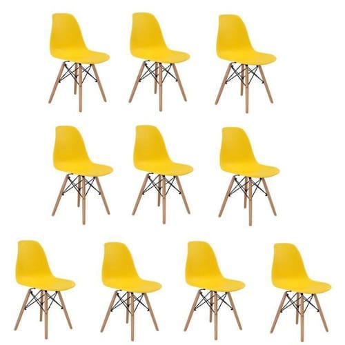 As cadeiras Eiffel são clássicas e modernas, garantindo conforto para sua casa sem perder o estilo. O conjunto com 10 peças proporciona um ótimo custo benefício para quem quer renovar a decoração! Conjunto com 10 cadeiras com assento em PP e base em madeira e aço pintado. O produto é entregue todo desmontado, pernas em madeira, apoio em aço e assento, acompanha os kits de montagem. Importante: recomendável para uso residencial. Este produto requer que seja feita uma manutenção regular simples, como apertar os parafusos periodicamente. Altura do Conjunto: 81.5 cm Ambiente: null Ambiente Principal: Sala de Jantar Cor: Amarelo Informação Complementar: 1x Conjunto 2 Cadeiras Eiffel PP Base Madeira AmareloLargura: 46 cmAltura: 81,5 cmPeso: 3,5 kgProfundidade: 51,5 cmNecessita Montagem: Sim2x Conjunto 4 Cadeiras Eiffel PP Base Madeira AmareloLargura: 46 cmAltura: 81,5 cmPeso: 3,5 kgProfundidade: 51,5 cmNecessita Montagem: Sim Possui Rodízio: Não Suporta Até (kg): 120 kg