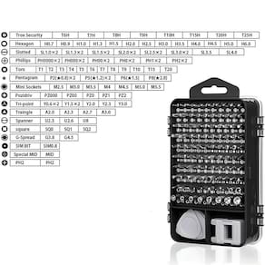 Otimize seus consertos com o Kit de Ferramentas de 115 Peças, ideal para profissionais e entusiastas de bricolagem. Equipado com 100 pontas intercambiáveis, incluindo Phillips, Flat, Torx, Pentalobe, Hex e muito mais, este conjunto oferece a solução perfeita para desmontagem e manutenção de eletrônicos, como smartphones, laptops, consoles de jogos e outros dispositivos delicados.