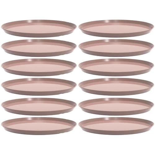 Garantia: 90 dias / Peso de cada: 138g / Cor predominante: amêndoa / Referência: 7794462512975; Dimensões de cada: 28cm (D) x 1,7cm (A); Conteúdo: 12 bandejas redonda; Material: polipropileno.