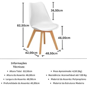 Tonalidade: Branco | Altura: 82,50 | Produto: Cadeira de Jantar Leda | Largura: 48,50 | Material da Estrutura: Madeira | Cor: Branco | Peso do Produto: 4,50 | Fabricante: Magazine Decor | Cômodo Indicado: Cozinhas | Acompanha Braço: Não | list_price: ,99 | Necessita Montagem: Sim | batteries_required: Não | included_components: 12 Cadeiras | is_fragile: Não | part_number: 1 | number_of_boxes: 2 | model_number: 1 | item_package_weight: 50 | bullet_point#0: A Cadeira de Jantar Eames Wood Leda vai dar um up na decoração do seu lar! Feitas em material de excelente qualidade, as cadeiras Eames Wood Leda Design são uma ótima escolha para fazer parte de cômodos como sala de jantar, área de recreação e lazer, entre outros locais | bullet_point#1: Apresentadas em , elas podem ser inseridas na decoração de diferentes estilos. As cadeiras Eames Wood Leda Design são ideais para quem está em busca de conforto e um design diferenciado. | bullet_point#2: Um diferencial importante destas cadeiras é que elas possuem uma base de madeira, este material confere mais resistência à cadeira e é um toque de estilo a mais no modelo. Vale a pena apostar nesta cadeira, a versatilidade permite que ele seja colocado em diversos espaços da casa. | number_of_items: 12 | Coleção Jardim: Não | Selecione: Cadeira de Jantar Leda | O Produto pode Expirar: Não | Certificação de teste externa: Não | Dimensões do item P x L x A: 82,50x48,50x42 | Certificado de Conformidade do Produto: Não
