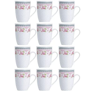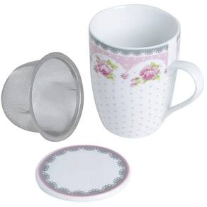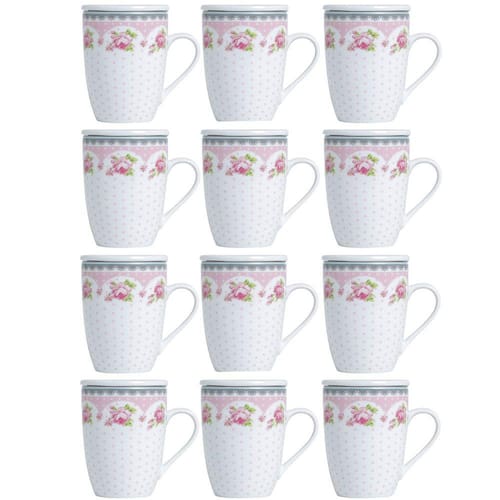 Garantia: 90 dias / Peso: 5,16kg / Cor predominante: rosa / Referência: 7899768021784X12 Dimensões de cada caneca: 12cm (C) x 9cm (L) x 11,5cm (A); Capacidade de cada: 310ml; Conteúdo: 12 canecas, 12 tampas e 12 filtros; Materiais: estrutura em porcelana e infusor em aço inox.