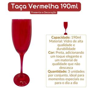 Conjunto 12 Taças Vidro Vermelha Champanhe 190 ml Nadir Conjunto 12 Taças Vidro Vermelha Champagne 190 ml Nadir Encante-se com o Conjunto 12 Taças de Champagne Nadir, um verdadeiro símbolo de requinte e estilo Com design moderno e sofisticado, esta taça de 190 ml combina a delicadeza do vidro com a vibrante cor vermelha, tornando cada gole uma experiência única. Perfeita para celebrações, jantares especiais ou até mesmo para um toque de charme no seu dia a dia. Benefícios: Design Elegante: A cor vermelha intensa e o formato clássico destacam qualquer ocasião, trazendo mais glamour aos seus acompanha. Alta Qualidade: Fabricada com vidro de alta durabilidade, proporcionando resistência e uma aparência impecável. Capacidade Ideal: Com 190 ml, é a medida perfeita para servir seu champagne, espumante ou qualquer bebida especial, permitindo uma apreciação completa dos aromas e sabores. Versatilidade: ideal para festas, jantares ou como presente sofisticado para quem aprecia o bom gosto. Transforme seus momentos de celebração com o Conjunto 12 Taças Vidro Vermelha Champagne 190 ml Nadir. Celebre a vida com muito mais estilo Enviamos a sua encomenda em até 24 horas após a confirmação do pagamento Caso tenha alguma dúvida nos mande mensagem que reponderemos rapidinho para te ajudar Marca: Não Informado