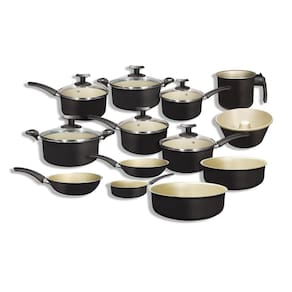 O kit é composto por: 01 - Panela de 14cm de diâmetro 01 - Panela de 16cm de diâmetro 01 - Panela de 18cm de diâmetro 01 - Panela de 20cm de diâmetro 01 - Caçarola de 16 cm de diâmetro 01 - Caçarola de 20 cm de diâmetro 01 - Fervedor de 14 cm de diâmetro 01 - Frigideira de 16 cm de diâmetro 01 - Frigideira de 18 cm de diâmetro 01 - Frigideira de 20 cm de diâmetro 01 - Forma de Bolo 25 cm de diâmetro 01 - Forma de Bolo 30 cm de diâmetro 01 - Assadeira retangular 30 cm de diâmetro Marca: Não Informado Ean: 7908540300174