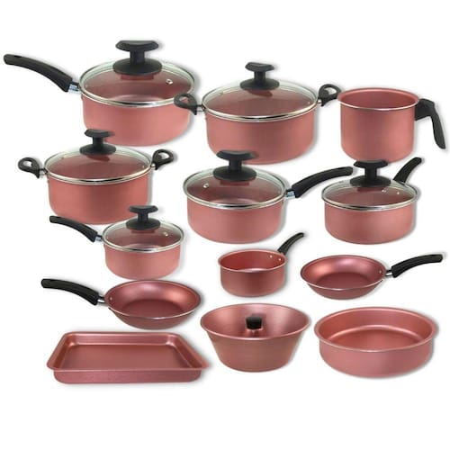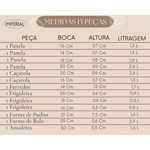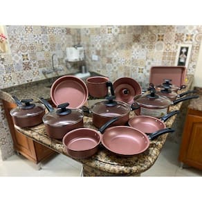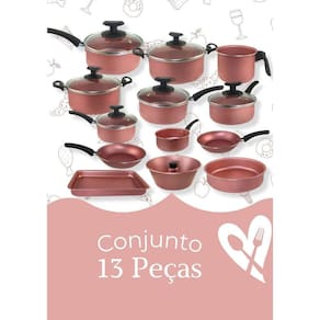 Conjunto 13 peças panelas frigideiras assadeiras teflon antiaderente novidade cor exclusiva Conjunto super rosé por dentro e por fora, lançamento exclusivo imperial todas as peças do conjunto são revestidas com teflon antiaderente por dentro e por fora que facilita muito a limpeza. Todos os produtos imperial possuem selo de qualidade inmetro. O conjunto de panelas mais completo com a qualidade que sua família merece e com o preço justo que seu bolso merece As panelas são em alumínio com revestimento antiaderente que além de facilitar a preparação de alimentos com maior rapidez e facilidade, torna a hora de lavar a louça uma tarefa mais simples. Os cabos, alças e pegadores da tampa são anatômicos em baquelite antitérmico, proporcionando maior segurança e durabilidade com elegância e modernidade para a sua cozinha ideal para cozinhar no dia a dia, proporciona qualidade e conforto. Material: teflon Antiaderente: sim Espessura material: 1,5mm 01 - panela de 14cm de diâmetro 01 - panela de 16cm de diâmetro 01 - panela de 18cm de diâmetro 01 - panela de 20cm de diâmetro 01 - caçarola de 16 cm de diâmetro 01 - caçarola de 20 cm de diâmetro 01 - fervedor de 14 cm de diâmetro 01 - frigideira de 16 cm de diâmetro 01 - frigideira de 18 cm de diâmetro 01 - frigideira de 20 cm de diâmetro 01 - forma de bolo 25 cm de diâmetro 01 - forma de bolo 30 cm de diâmetro 01 - assadeira retangular 30 cm de diâmetro. Obs: as formas podem variar de acordo com a disponibilidade em estoque. A foto é meramente ilustrativa. Marca: Alumínio Imperial