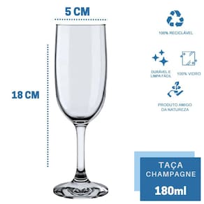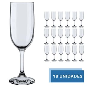 Informações complementares: Modelo: Champagne Cor: Transparente Material: Vidro Capacidade: 180ML Peso: 162G (Cada Unidade) Altura: 18CM Diâmetro da boca: 5CM Itens inclusos: Conjunto com 18 Taças