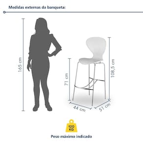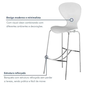 É uma banqueta de plástico com encosto para área gourmet? Sim, seu assento em polipropileno e encosto anatômico oferecem conforto mesmo em uso prolongado. Acabamento da Estrutura: Pintura Altura do assento até o chão: 71 cm Altura do Encosto: 39 cm Altura Regulável: Não Ambiente Principal: Cozinha codigo_ean: 7900288230423 Cor: Branco Cor do Produto: Branco Dobrável: Não Escala de Brilho: Semi-Fosco Informações Complementares: Por se tratar de produto injetado, pequenas variações de tonalidade de cor são intrínsecas ao produto, e não podem ser consideradas defeito. Para aprimoramento de projeto, os produtos podem sofrer modificações. Itens Inclusos: 2 Banquetas Linha ou Coleção: Flash Marca: Prima Design Material do Assento: Polipropileno Material do Encosto: Polipropileno Necessita Montagem: Não Origem do Produto: Nacional Peso: 7,2 kg Possui Apoio Para os Pés: Sim Possui Encosto: Sim Possui Rodízio: Não Recomendações de Uso, Manutenção e Limpeza: A estrutura deve ser limpa utilizando pano seco de algodão ou flanela. Se necessário, utilize pano umedecido apenas com água, secando o móvel em seguida. Não utilize solvente, álcool, acetona, lustra móveis, produtos abrasivos e outros produtos que contenham soda e ou ácidos para limpar e tirar manchas dos móveis. Não expor os móveis à luz solar e ambientes com umidade relativa elevada. Tipo de Assento: Fixo Tipo de Encosto: Fixo Marca: Não Informado
