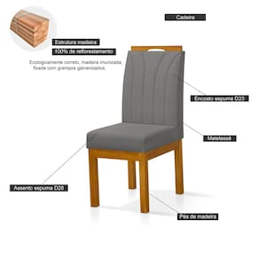 Garantia 03 Meses Materiais e Acabamentos Material Principal Eucalipto Escala de Brilho Fosco Material dos Pés Madeira Maciça Montagem Necessita Montagem Sim Complexidade da Montagem Baixa: pode ser montado por uma pessoa sozinha Sistema de Montagem incluso Recomendações de Uso, Manutenção e Limpeza Não Utilize produtos químicos, nem aparelhos a vapor ou secador quente Características Almofada do Assento Fixa Marca Konfort King Tipo de Encosto Fixo Tipo de Assento Fixo Suporta Até (kg) 100 kg Possui Rodízio Não Dobrável Não Giratória Não Estilo Moderno Enchimento do Encosto Espuma D-23 Enchimento do Assento Espuma D-28 Cor do Produto Cinza Claro Origem do Produto Nacional Ambiente Principal Sala de Jantar