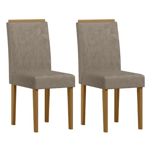 Conjunto 2 Cadeiras Ana - New Ceval Apresentamos o Conjunto de 2 Cadeiras Ana, ideal para quem busca elegância e conforto. Com estrutura em MDF e pintura UV, essas cadeiras são revestidas em tecido e possuem espumas D-18 no assento e no encosto, garantindo maciez e durabilidade. As cantoneiras de travamento em aço carbono proporcionam maior estabilidade, e os pés em MDF complementam o design robusto. Cada cadeira suporta até 120 kg, sendo perfeitas para sua sala de jantar.
