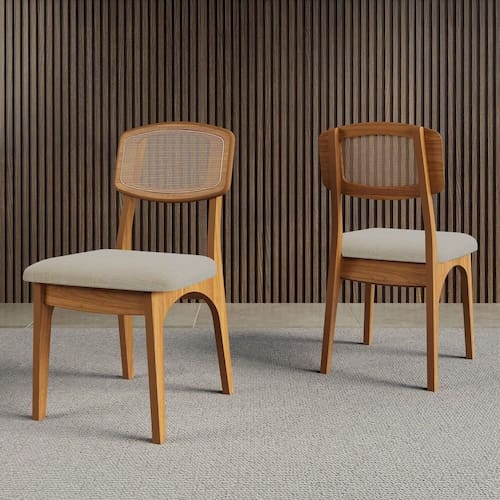 Conjunto de duas cadeiras estofadas ref ca40 tecido tecido na cor tweed claro, 28% de algodao 72% poliester, produzidas em mdf com acabamento pintura UV na cor freijo madeirado, 7 camadas, alta durabilidade , encosto com acabamento em tela sintética Acabamento: Perfect Touch Acabamento da Estrutura: Pintura UV Almofada do assento: Fixa Altura do assento até o chão: 48 cm Altura dos Pés: 48 cm Ambiente Principal: Sala de Jantar codigo_ean: 7900288142436 Complexidade da Montagem: Média: pode ser montado por mais de uma pessoa e/ou necessite de maior conhecimento para montagem Cor: Freijó Madeirado Cor do Produto: Freijó Madeirado Cor dos Pés: Marrom Dimensões do assento: 42x46 Dobrável: Não Enchimento do Assento: Espuma D-23 Escala de Brilho: Fosco Estrutura do Assento: MDF Estrutura do Encosto: MDF Giratória: Não Itens Inclusos: 2 Cadeiras, Manual de Montagem e Kit Ferragens Manual de Montagem e Instalação: https://cdn2.madeiramadeira.com.br/atributo/dalla-costa/2907826-3781-17466376851321.pdf Marca: Dalla Costa Material da Base: MDF Material dos Pés: MDF Material Principal: MDF Necessita Montagem: Sim Origem do Produto: Nacional Peso: 12,5 kg Possui Apoio para Braços: Não Possui Apoio Para os Pés: Não Possui Assento/Encosto Estofados: Possui Somente o Assento Estofado Possui Espaldar: Sim Possui Rodízio: Não Quantidade de Itens: 1 Recomendações de Uso, Manutenção e Limpeza: Pano seco Revestimento do Assento: tecido Revestimento do Encosto: TELA SINTETICA Tamanho do Produto: 48x90x56 Tipo de Assento: Fixo Tipo de Encosto: Fixo