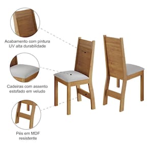 Importante sobre a : A é realizada até a portaria ou porta de entrada do indicado, desde que o acesso seja permitido. Para locais com portaria, a será feita no piso térreo. Não realizamos montagem, desmontagem, por escadas ou içamento. É responsabilidade do cliente verificar se as dimensões do produto são compatíveis com portas, elevadores e corredores. Evite imprevistos: confira todos os detalhes antes de concluir sua compra. MEDIDAS:: [ A ] = 89 cm [ L ] = 36,6 cm [ P ] = 51 cm | PESO:: 12,60 Kg | PESO SUPORTADO:: 80 Kg cada | MODELO:: Conjunto 2 Cadeiras Veludo Sala de Jantar Kate Viero | MARCA:: Viero | ESTRUTURA:: MDP/MDF | ACABAMENTO:: Pintura UV | TECIDO:: Veludo toque macio | REVESTIMENTO ASSENTO:: Espuma D26 | PÉS:: MDF | SAPATAS:: Plásticas | DIFERENCIAL:: Cadeira com assento acolchoado, pés em MDF, revestimento em tecido veludo | SISTEMA DE MONTAGEM:: Parafusos e cavilhas | ITENS INCLUSOS:: 2 Cadeiras, 1 manual de montagem e 1 kit parafusos | INSTRUÇÕES E CUIDADOS:: Limpar com pano levemente umedecido com água, não utilizar produtos abrasivos | GARANTIA:: 3 meses pelo fabricante | AVISO: Importante sobre a : A é realizada até a portaria ou porta de entrada do indicado, desde que o acesso seja permitido. | Profundidade do assento: 51 | Quantidade de cadeiras por conjunto: 2 | Requer montagem: Sim | Largura do assento: 36,6 | Altura da cadeira: 89 | Inclui manual de montagem: Sim | Cor: Madeirado/Off White